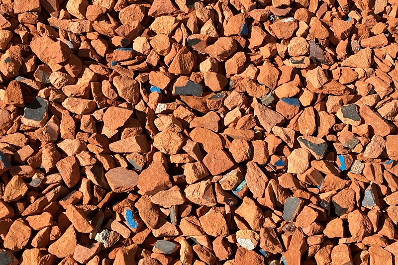 瓦チップは、廃材となった屋根瓦を破砕したもので、外構の床面に砂利のように撒いて利用できます。これまで利用用途がなかった瓦を再利用しているので、環境に優しいエコ資材として注目が高まっています。